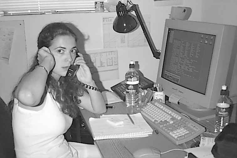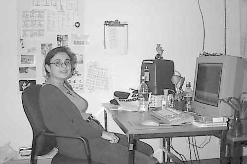 Laure aprés une dure journée de labeur. En cherchant bien, sur la table, il y derriere le clavier, devant la bouteille une tortue centenaire (et virtuelle aussi.) On remarquera aussi la présence de plantes vertes sur ce bureau.