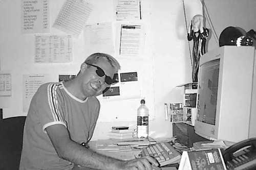 Alain aux moments les plus chauds de la prod. Aujourd'hui il a l'air content. Il a probablement bien dormi. Il s'aprète à sortir une vanne, pour faire rire Marco.
