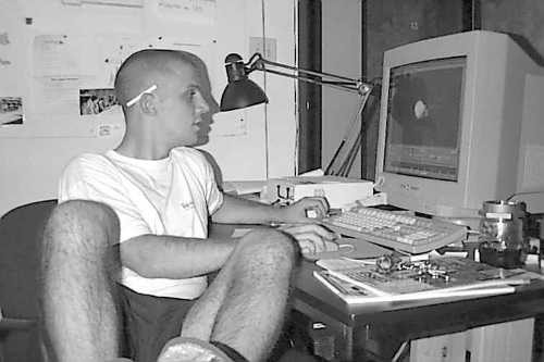 Un sourire "un peu" forcé, des lunettes de soleil pour le flash, car la pièce dans laquel travaillent Nico et Xavier n'a pas de fenêtres. Malheureusement la boite à rythmes portable de Nico n'est visible sur cette image. Elle est cachée derrière l'écran. Heureusement, vous n'avez pas à l'entendre.