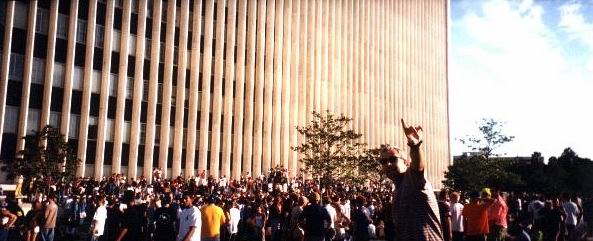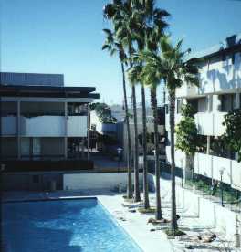 Voici Westwood appartments, au milieu de West Los Angeles. La photo a été prise de l'appart d' Edouard. Chacun d'entre nous avait un appartement dans cette "résidence de charme, avec piscine, jacousie, BBQ, sauna, tennis, terrain de basquette, salle de muscu, plafond en amiante, et peinture murale au plomb ...".