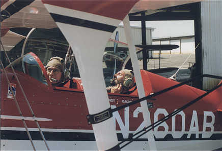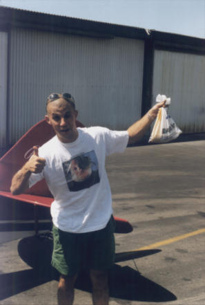 "On n'a jamais vu Pitof comme ca!" (unanime). Agréable victime d'un micro-climat favorable, Pitof est de bonne humeur. Au moment de la photo, il pense à la météo toujours propice à la voltige, au magnifique Pitts rouge qui l'attend chaque jour dans un hangar à 15 minutes de chez lui, et peut-être à la serveuse blonde de "Bellini". En fait, il faut bien avouer que personne ne sait à quoi pense Pitof. Il est peut-être simplement en train de s'assoupir.