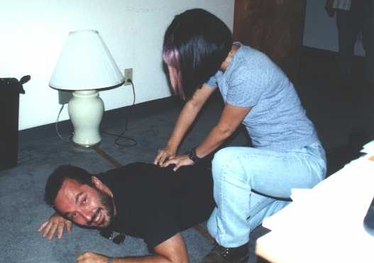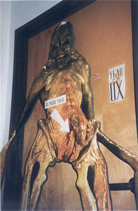 Kristof a toujours le sourire aux levres, ce garçon oeuvre aux entrées/sorties. C'est un métier difficile, avec de lourdes responsabilités, de la pression, beaucoup de travail. Il faut parler anglais et avoir des nerfs d'acier. A coté se trouve qui vous savez... Alors, de temps en temps, il peut craquer. C'est permis. En fait, il mime une terrifiante scène d'attaque d'un face-hugger. Si vous avez un role a lui proposer, n'hesitez pas.
