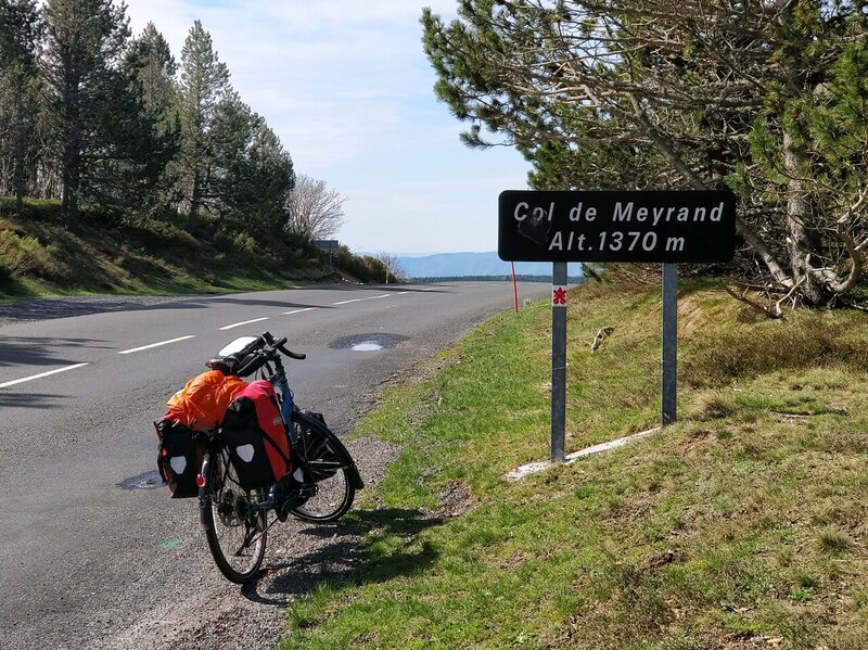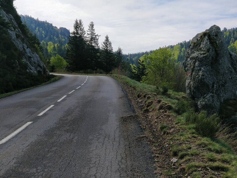 Descente du col de Bez vers le Chambon via un petit chemin de mule. Le vélo souffre, l'acier est souple, il travaille. J'y vais molo. Une fois en bas je monte au col de Meyrand.