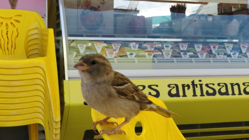 Une glace à St Pierre la Mer, les moineaux sont friands des cornets de glace... 🍦