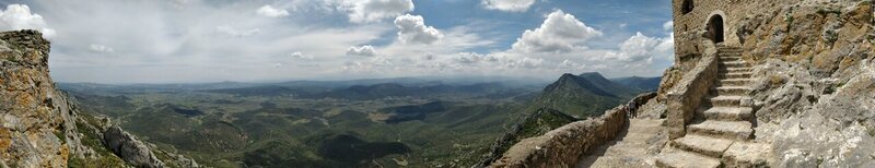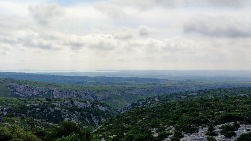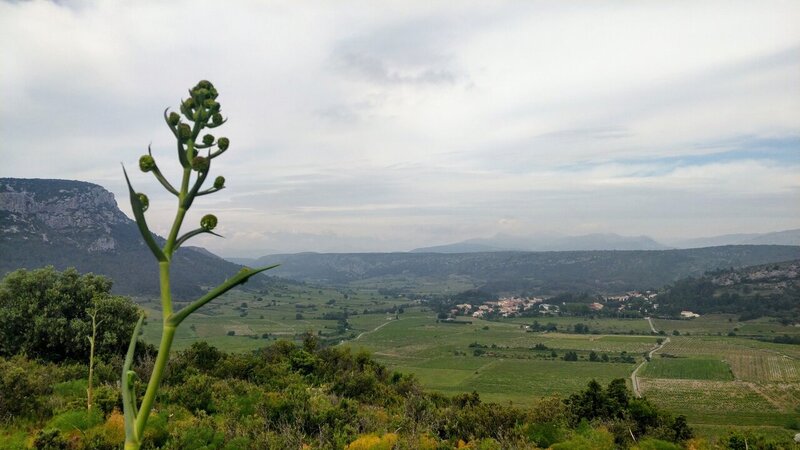 Il commence à faire bien chaud. Au loin j'aperçois sur les Corbières, une tour. Peut être est-ce Quéribus?