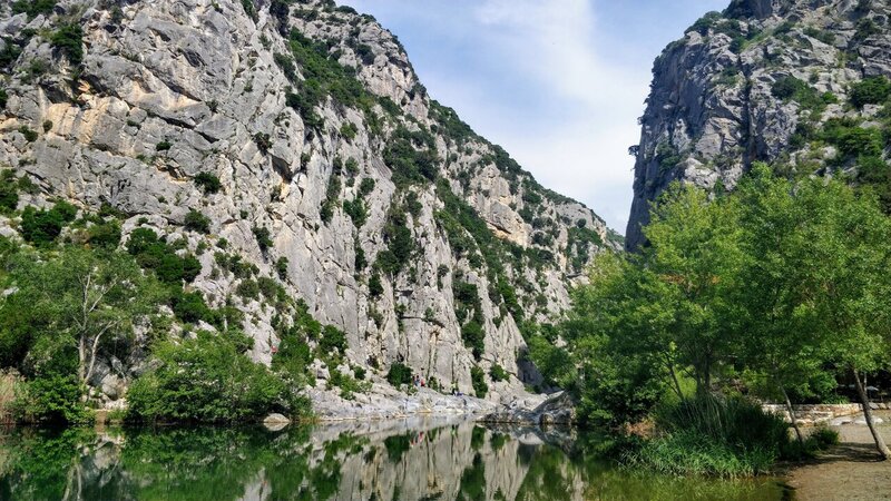 À droite une gorge qui me fais penser à celle d'Héric. À peine indiqué je vais voir. C'est au pied des cavernes de Tautavel. Un endroit paradisiaque, avec une jolie rivière, et pas mal de randonneurs.