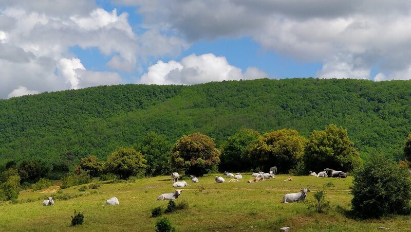 En descendant, je croise un paturage paisible avec une race de vaches que je ne connais pas, elles étaient tranquilles. En famille avec le mastard au fond à droite qui surveillait ce que je faisais.